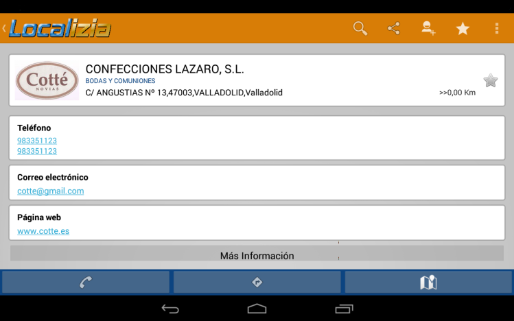 En la ficha personalizada de cada empresa se puede encontrar toda la información necesaria para contactar con ella (mediante llamada, email…), ampliar información sobre sus productos o servicios y visitar sus ofertas en su propio sitio web dentro de la red de Localizia.